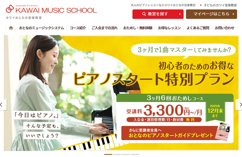 - 対面教室なら、カワイおとなの音楽教室・ヤマハ・島村楽器がおすすめ